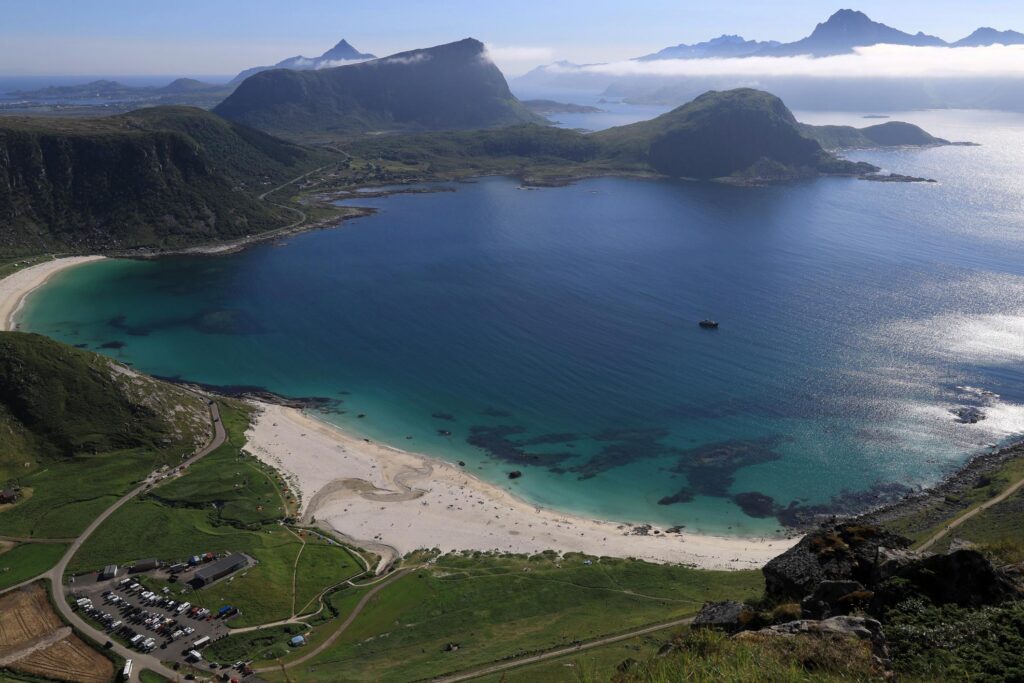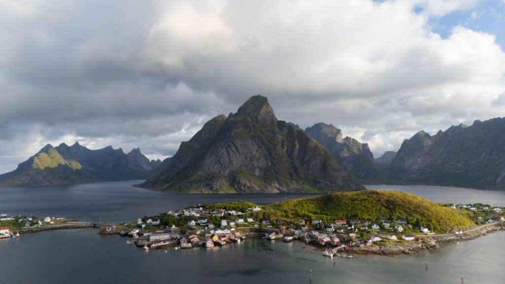 Jagged mountains rise directly from the sea, colorful fishing villages dot the coastline, and quiet Arctic beaches stretch beneath towering peaks.